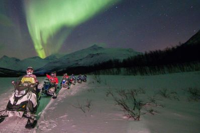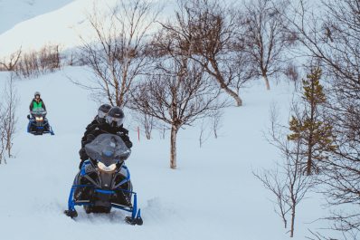 Experience the thrill of evening snowmobiling in Tromsø's winter wonderland. Book now for an Arctic adventure under the Northern Lights!