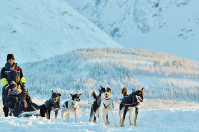 Guide your own dog sled through snowy trails, surrounded by the stunning Arctic mountain scenery!