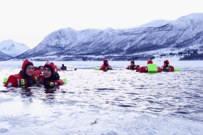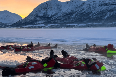 Dive yourself in the Arctic Ocean, floating effortlessly in our advanced rescue suits for a unique and cozy experience in chilly waters.